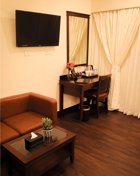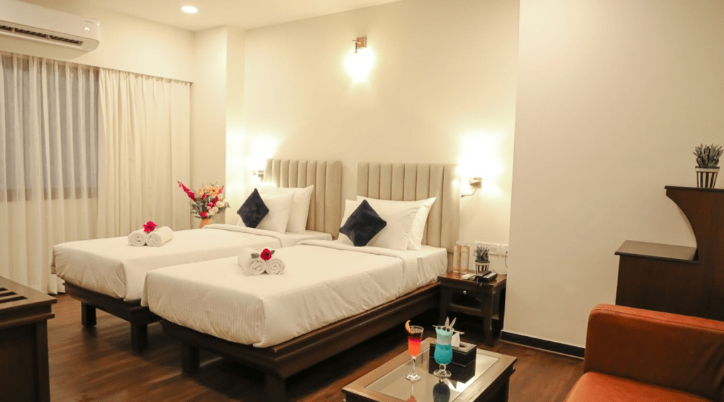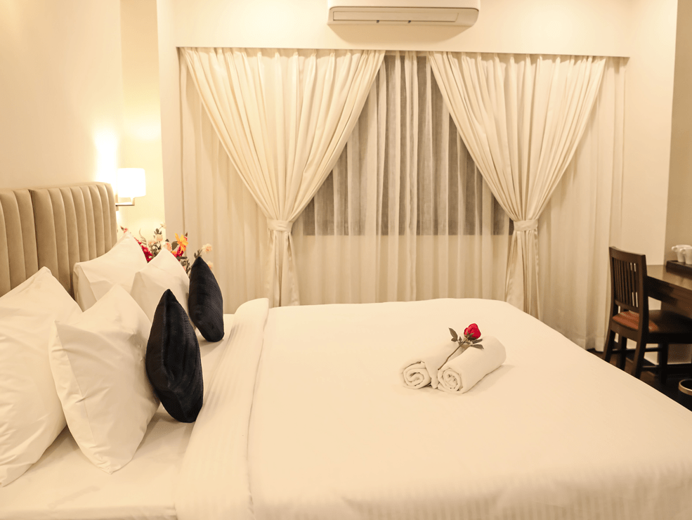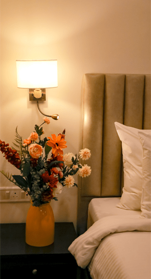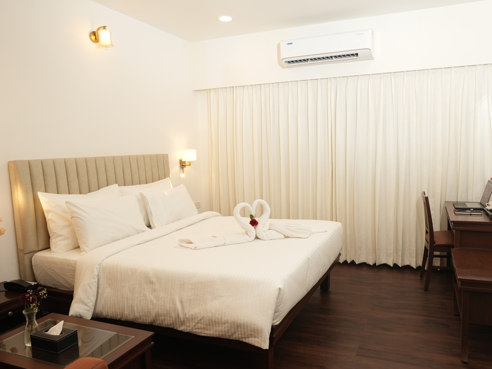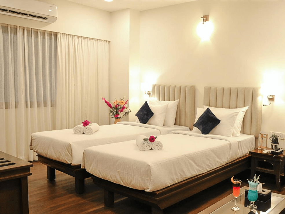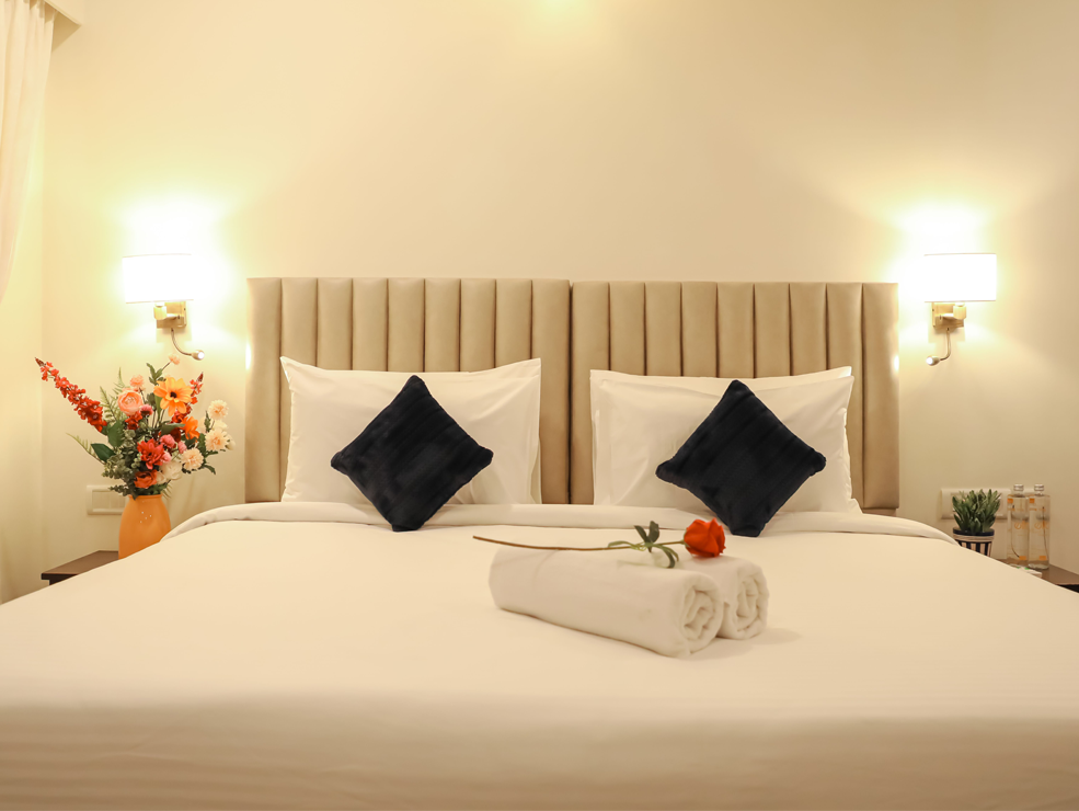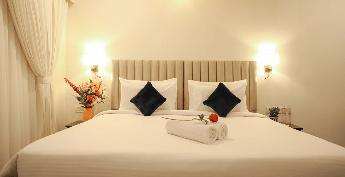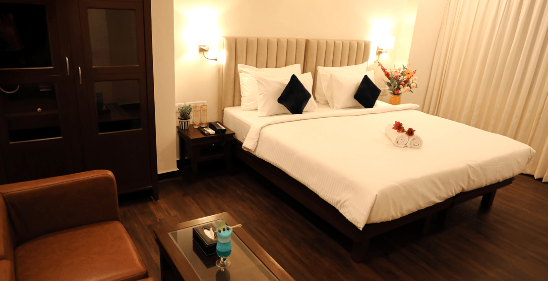 The Deluxe Room offers a touch of sophistication with its king-sized bed, contemporary earthy interiors, and elegant wooden flooring that create a warm and inviting ambiance.