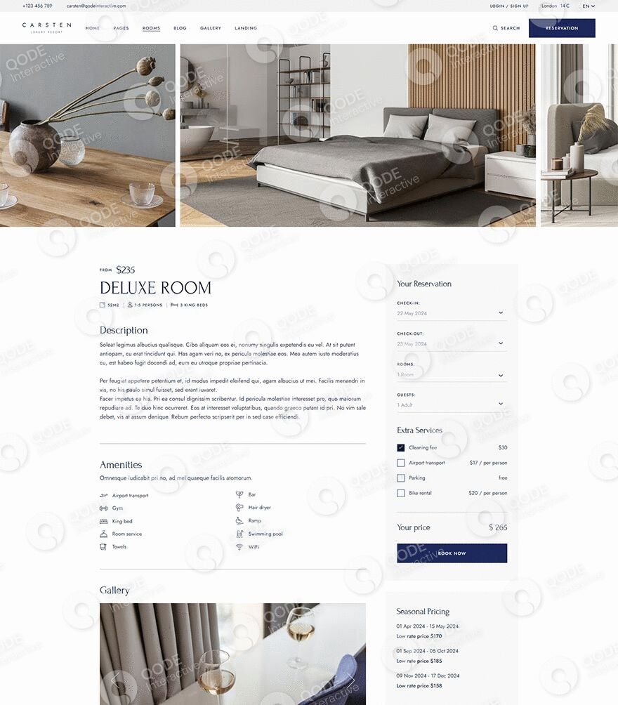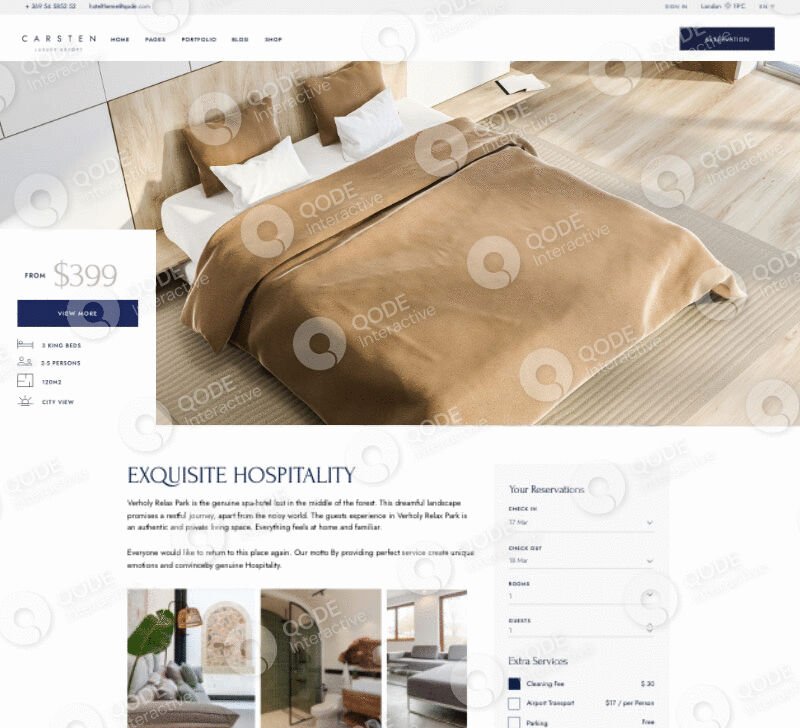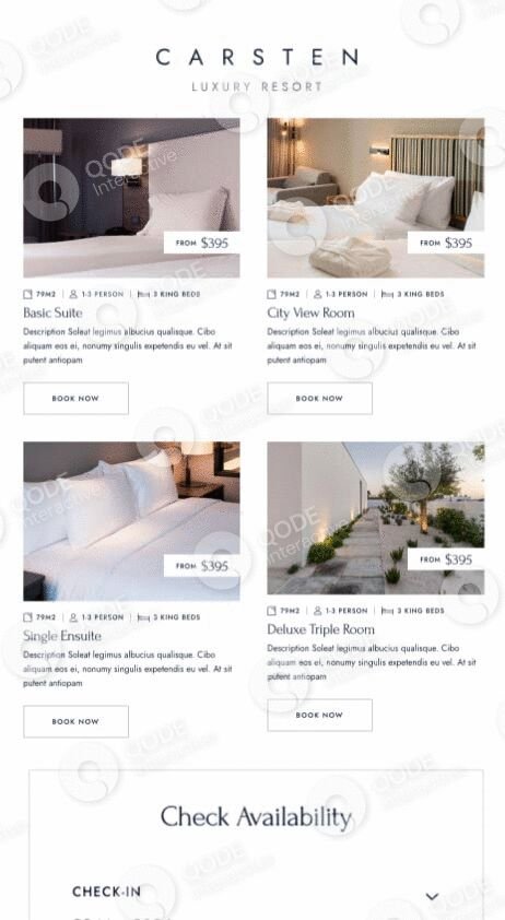 Carsten lets you include room reservation filters which your visitors can easily interact with. All they need to do is select the desired dates, number of rooms and guests, & their booking is good to go!