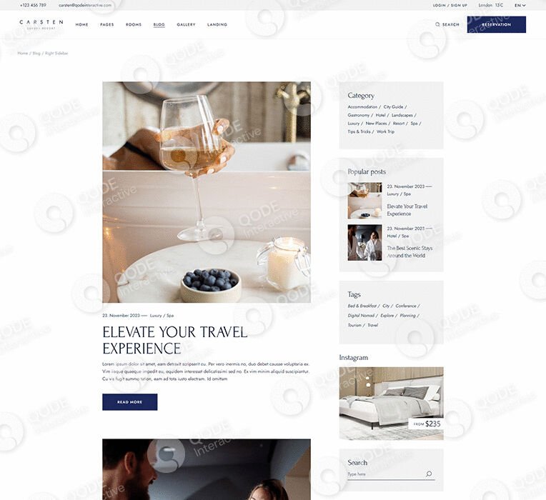 Present your establishment & premises, introduce offers & promos, menus, or launch a captivating blog, all thanks to Carsten’s readymade inner pages & blog layouts.