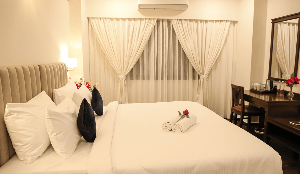 The Deluxe Room offers a touch of sophistication with its king-sized bed, contemporary earthy interiors, and elegant wooden flooring that create a warm and inviting ambiance.